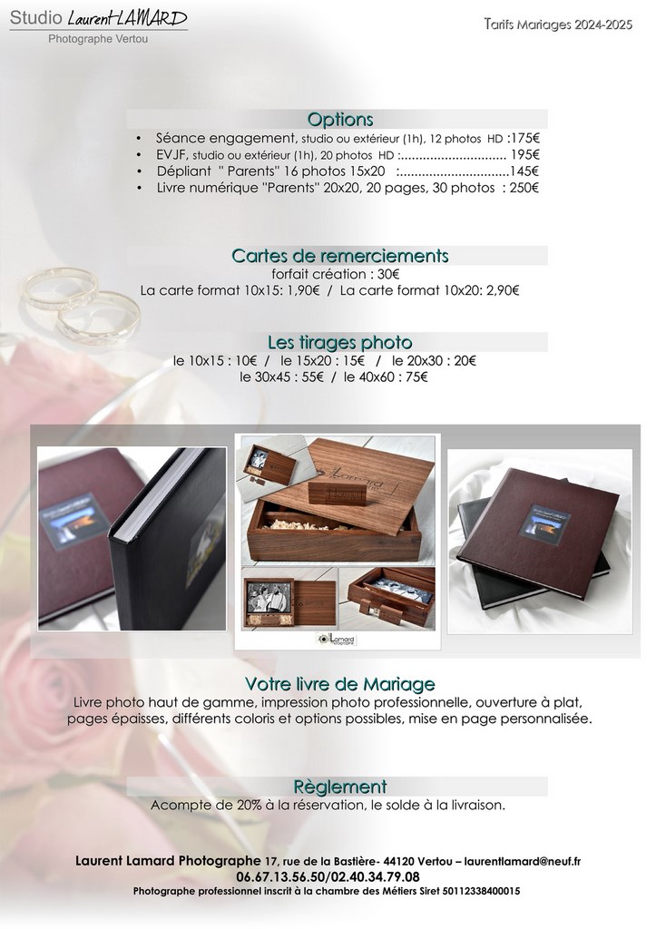 Je vous propose différentes formules (incluant ou non les préparatifs, la soirée), plusieurs supports sont possibles (albums, livres , coffret bois clé USB).